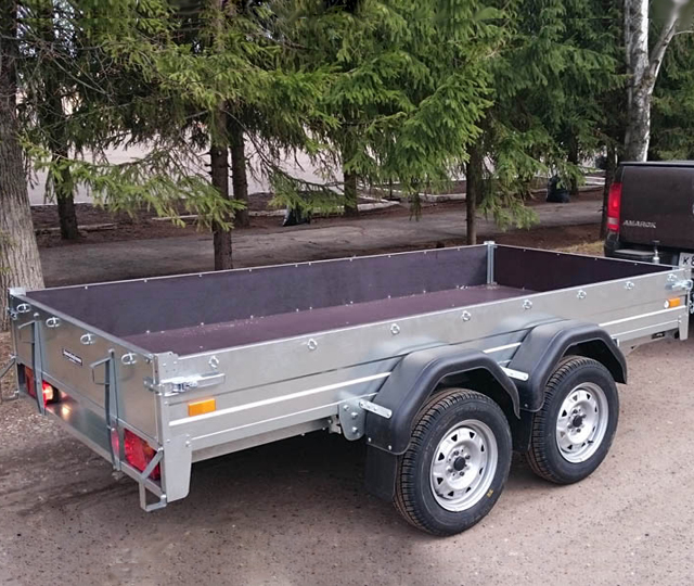 Металлоконструкция прицепа полностью выполнена из качественного оцинкованного листа с применением лазерной технологии раскроя. Передний и задний борта на петлях, боковые борта выполнены съёмными на болтовых соединениях. Настил платформы и внутренние поверхности откидных бортов выполнены из влагостойкой фанеры толщиной 9 мм. Прицеп имеет две оси из качественных труб Ф60 мм. Подвеска на четырех рессорах с телескопическими амортизаторами.